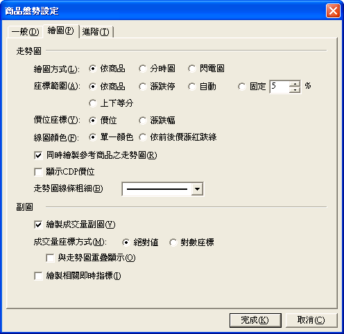 - 繪圖方式:提供分時圖及閃電圖兩種方式來畫走勢圖。若選擇依商品,系統依照所選商品自行判斷以分時圖或閃電圖來繪圖。