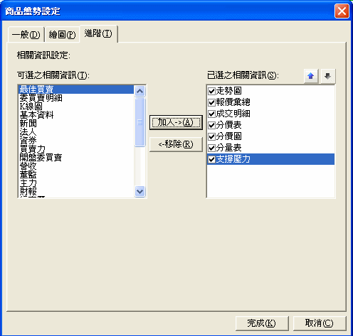 - 預設相關資訊:包括:成交明細、分價表、分價圖、支撐壓力、委買賣明細、K線圖、新聞、法人、資券、買賣力、開盤委買賣、營收、主力、財報、行事曆、相關商品、參考商品、大盤、速覽。但資訊項目會因商品不同,所能支援的項目也因此不同。