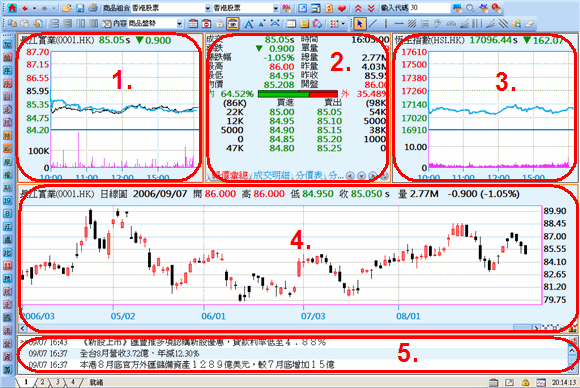 - 點選主功能列中「個股」,接著選取「香港個股走勢分析」,再選取「個股走勢與K線對應」。
