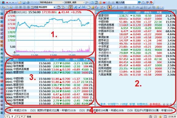 - 成交跑馬燈:恆生指數權值股成交訊息。