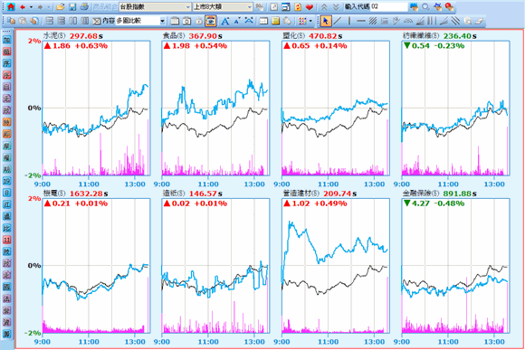 點選主功能列中「大盤」,接著選取「台股類股指數」,再選取「上市8類比較圖」或「上市19類比較圖」或「上櫃11類比較圖」。