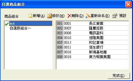 在商品盤勢的設定中,指定上下檔的順序,以方便切換個股。假定以[test]為準,若現在畫面中的商品是匯豐控股,則其上一檔為長江實業,其下一檔為電訊盈科。