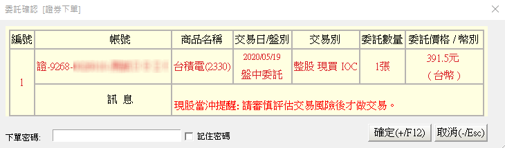 以滑鼠左鍵點擊下單列( )按鈕,會彈出「委託確認」下單對話盒如下圖,輸入登入密碼也可勾選「記住密碼」,按下〔確定送出〕鈕,即可送出委託;若按下〔取消〕鈕,則取消此筆委託單的送出動作。 |