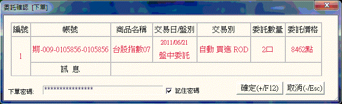 以滑鼠左鍵點擊下單列( )按鈕,會彈出「委託確認」下單對話盒如下圖,輸入登入密碼也可勾選「記住密碼」,按下〔確定送出〕鈕,即可送出委託;若按下〔取消〕鈕,