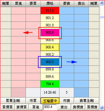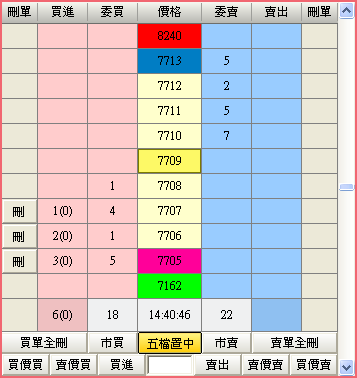 按〔左鍵〕系統會依( )色塊所在價格送出「買進」委託。