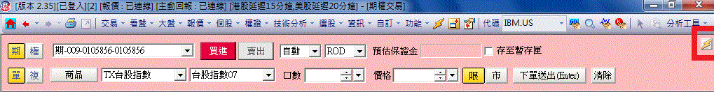 下拉式選單,提 供〔ROD〕當日有效、〔IOC〕立即部份成交、〔FOK〕立即全部成交,三個選擇條件 ,(市價單不接受 〔ROD〕)。