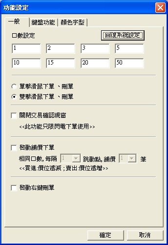 「口數設定」:可分別於八個口數欄位中,設定常用的交易口數,按下確定後,口數快速按鈕會顯示所設定