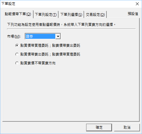 下單列預設買賣別,提供”買”、”賣”或”不預設’選項。
