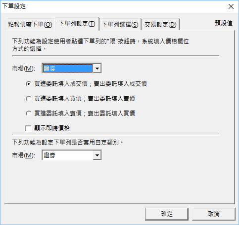 設定使用者點選下單列的〔限〕按鈕時,系統填入價格欄位的選擇。
