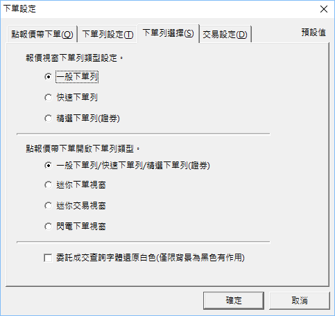提供〔點報價帶下單〕、〔下單列設定〕、〔下單列選擇〕、〔交易設定〕。