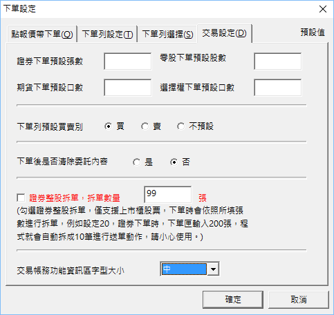 證券拆單設定:勾選證券整股拆單,並於( )輸入每筆預設拆單的數量,下單輸入數量超過預設數量就進行拆單交易。