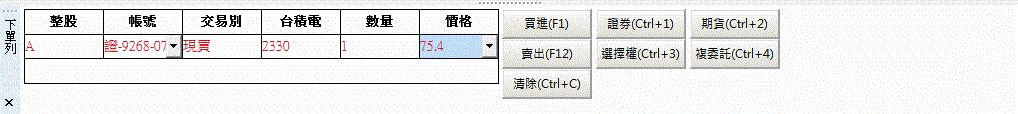 各業務下單介面操作方式,請參考〔證券〕、〔期貨〕、〔選擇權〕、〔複委託〕下單介面說明。 |