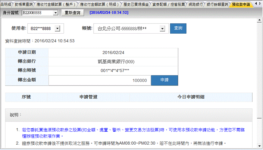由交易Menu"證券帳務"點選進入「預收款申請」。