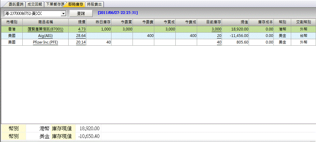 由交易Menu"複委託交易"點選後進入「即時庫存」。