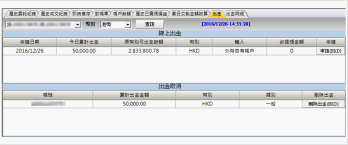 於[出金取消]清單中,可選擇欲取消的出金交易,按[刪除出金]即可取消該筆出金申請。