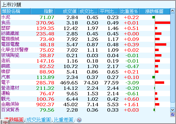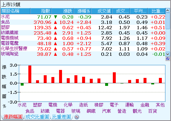 資金流向,分析台灣股市交易所中,上市19類、上市8大類上市29類、及上櫃類股中各類股的指數變化及成交比重,以觀察市場資金動向,掌握類股輪動節奏。