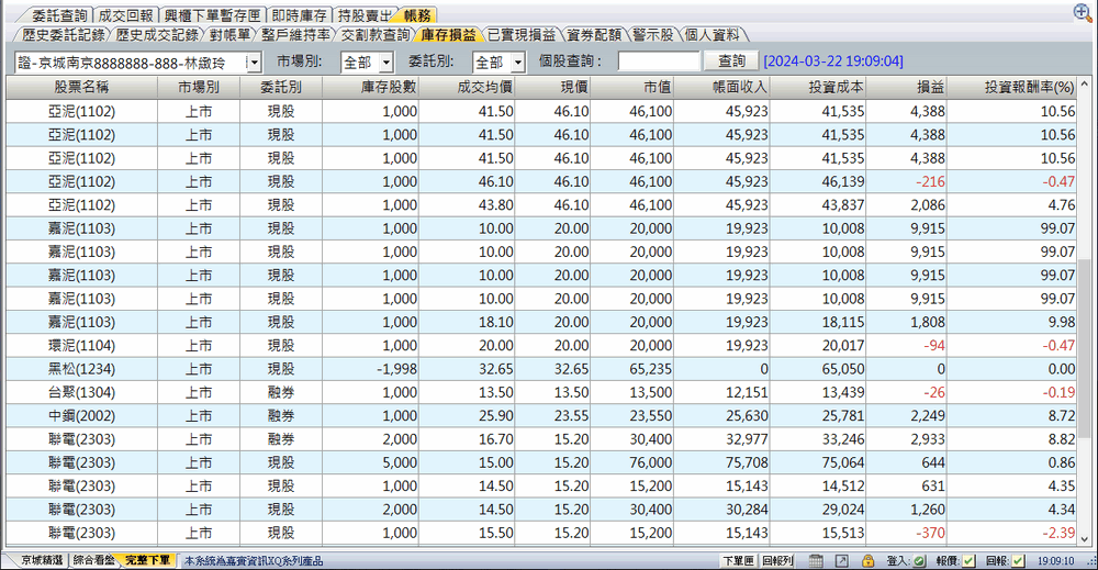 )提供委託別 選單「全部」、「現股」、「融資」、「融券」 選項。