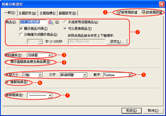 接著會跳出對話盒,相關設定分別列示在[一般]、[主圖設定]、[主圖指標]、[副圖設定]的Tab內,以供修改。依序說明如下。