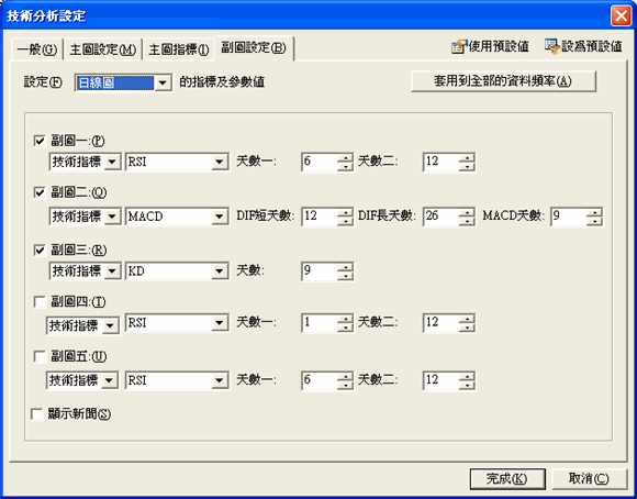 副圖設定:設定不同資料頻率的副圖技術指標及屬性。以