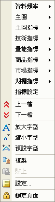 4.在畫面上按滑鼠右鍵,會出現功能選單,可以切換資料頻率、主圖類型、副圖類型等項目。