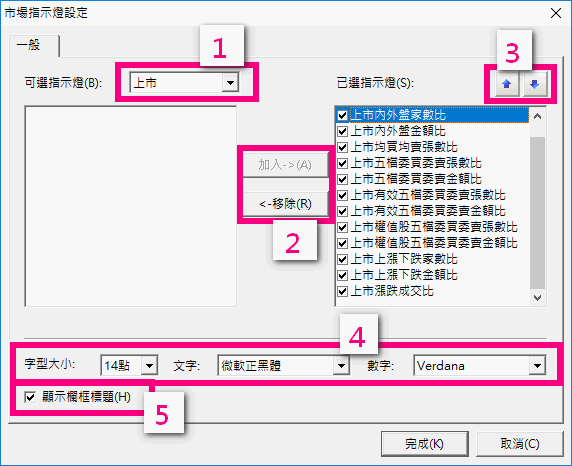 2. 選擇使用者關心的市場指示燈按[加入],或按[移除]刪除已選定的市場指示燈。