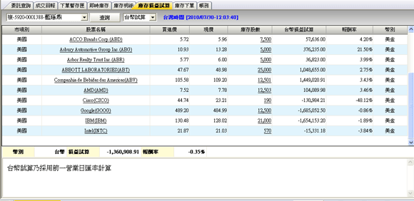 由 完整下單/帳務 頁面點選「庫存損益試算」頁籤。