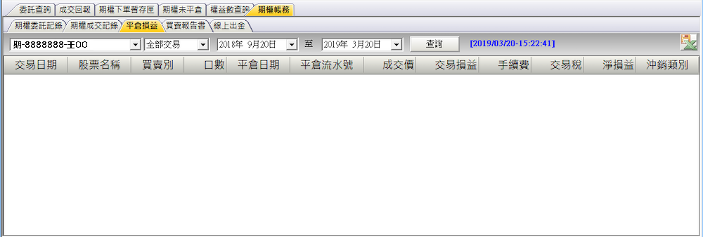 由交易頁面群組按鈕的「期貨選擇權」點選「平倉損益」。