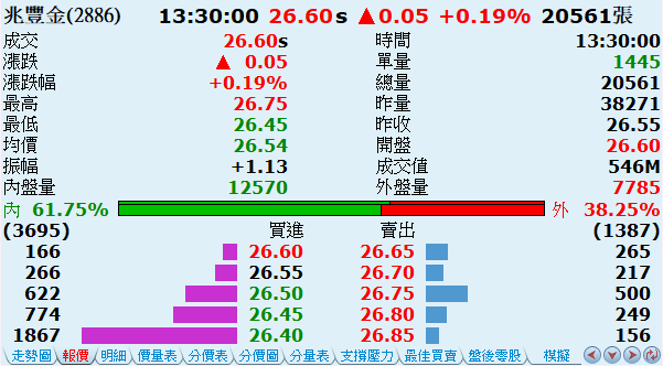 內外盤量之比:紅色代表外盤量的比率,綠色代表內盤量的比率。圖中較粗的柱狀,表示開盤迄今累計值的比例圖;而較細的柱狀,表示最近十五分鐘的累計數值比例圖。