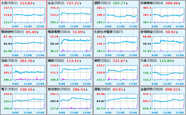 - 列示上市類股中主要十六類股即時商品盤勢,方便使用者在同一個畫面觀察當日大盤各類股的漲跌走勢變化。由上至下,由左至右分別為: