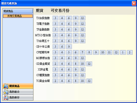 ( )點選後,使用者可透過〔期貨代碼查詢〕來選擇商品。縱軸為台灣期貨交易所的期貨商品名稱,橫軸