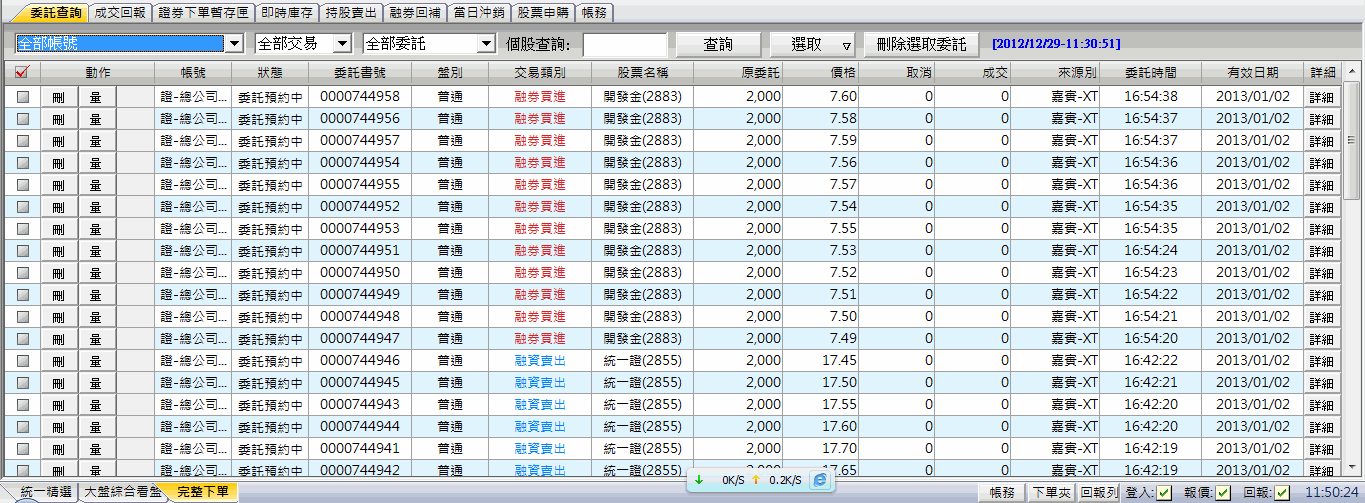 、「委託失敗」、「委託/成交」選項。 |