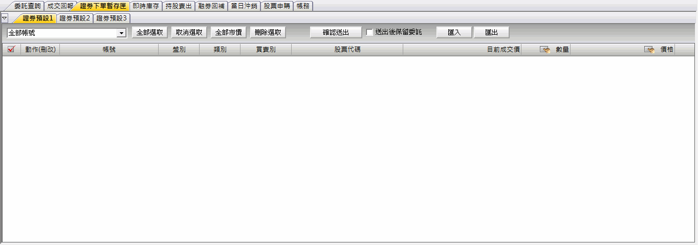 的交易列上,點選交易內容後,勾選( )按( )鈕,交易資料將暫存在下方的工作表暫存區。 |