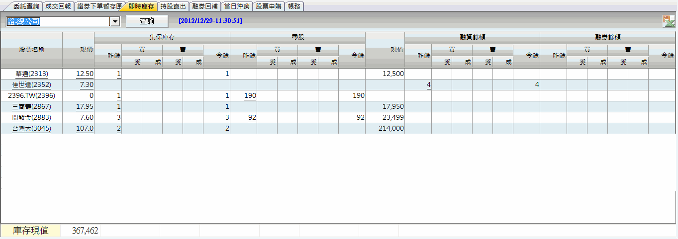 以滑鼠左鍵點選如下圖的即時庫存內容中有出現底線的欄位,系統會自動將相關的交易資料帶到交易列中