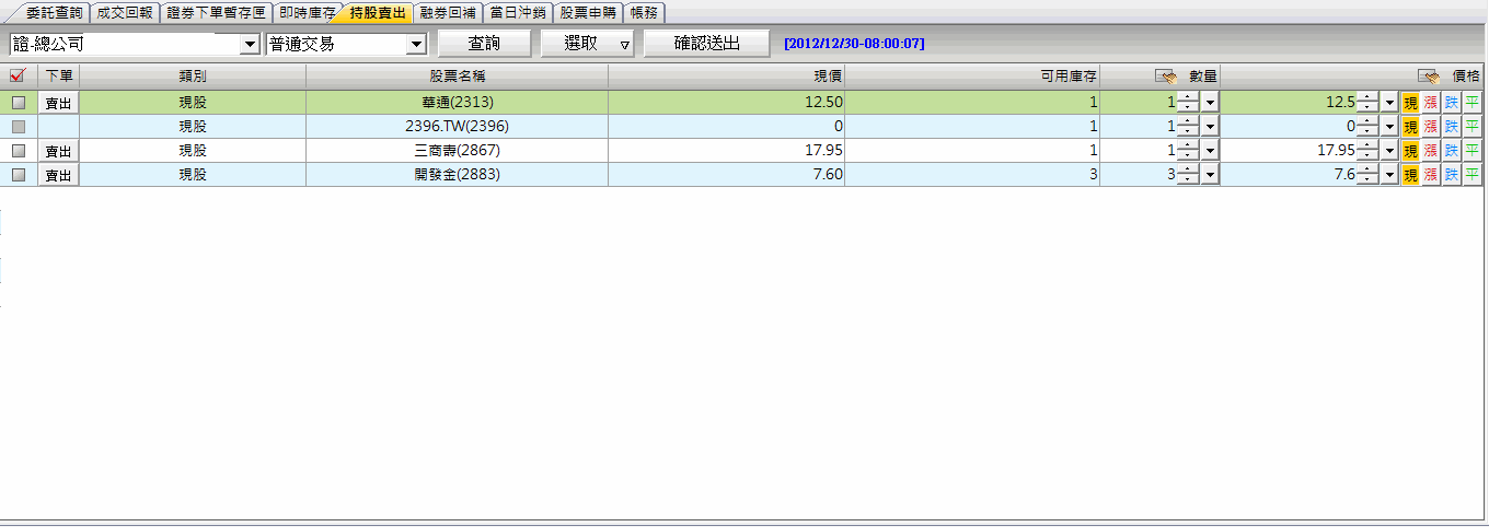 )按鈕, 〔 現〕為當時成交價 ,〔漲〕為漲停價格 ,〔跌〕為跌停價格,〔平〕為平盤價格。