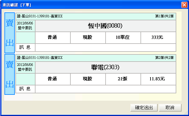 )按鈕,會彈出「委託確認」下單對話盒如下圖,按下〔確定送出〕鈕,即可送出委託;若按下〔取消〕鈕,則「取消」本筆委託。
