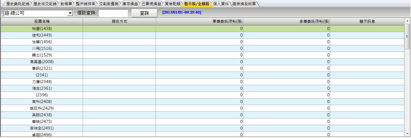 )按鈕,工作表會顯示 選取的警示股/全額股資料。
