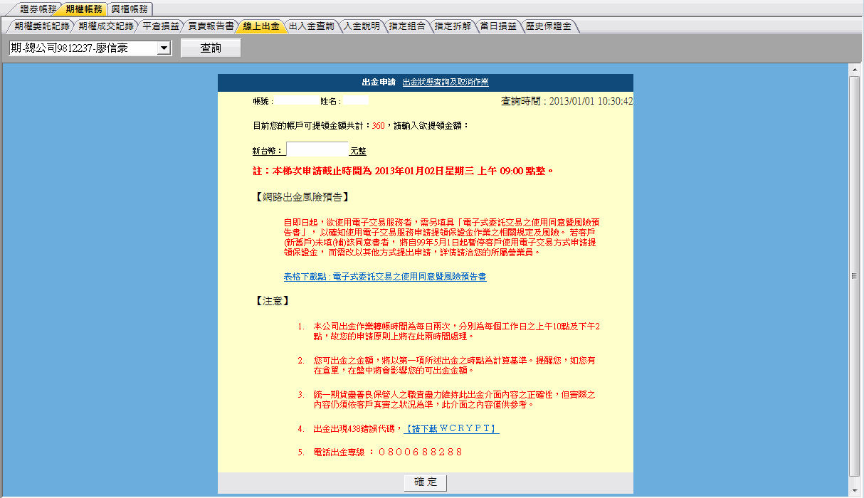 以滑鼠左鍵點擊"確定"按鈕,送出出金委託。