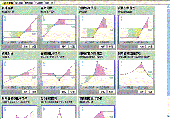 〔看多策略〕提供11種交易方式 :〔買進買權〕、〔賣出賣權〕、〔買權多頭價差〕、〔賣權多頭價差〕、〔逆轉組合〕 |