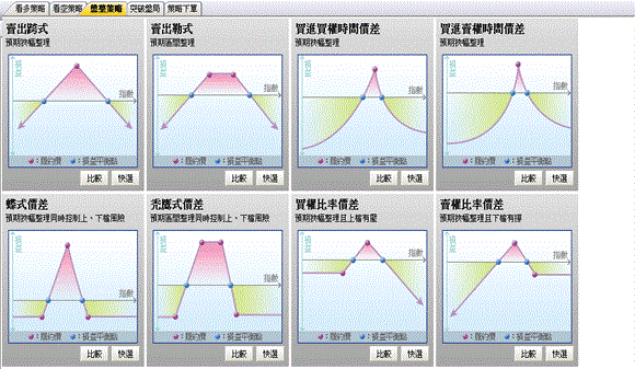 〔盤整策略〕提供8種交易方式 :〔賣出跨式〕、〔賣出勒式〕、〔買進買權時間價差〕、〔買進賣權時間價差〕、 |