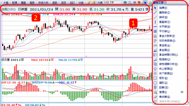 1. 可利用工具列中的分析工具進行畫線分析,詳細功能,請參見: