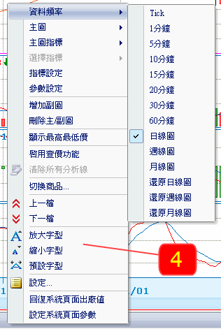 在畫面上按滑鼠右鍵,會出現功能選單,可以切換資料頻率、主圖類型、副圖類型等項目。
