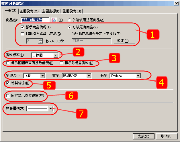 接著會跳出對話盒,相關設定分別列示在[一般]、[主圖設定]、[主圖指標]、[副圖設定]的Tab內,以供修改。依序說明如下。