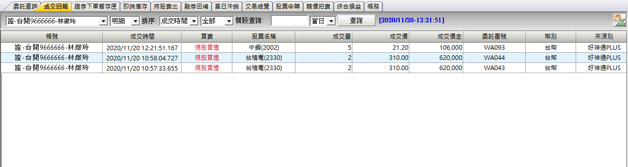 「成交時間」、「委託書號」、 「股票名稱」、「買賣」選項。 |