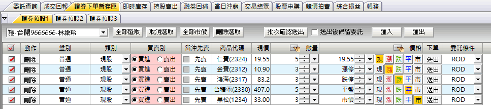 以滑鼠左鍵點擊( )按鈕,可將工作表內已選取之委託資料,買進委託自動變更漲停價格,賣出 |