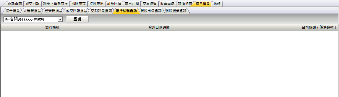 由交易頁面"群組按鈕"的「證券」點選「綜合損益」的「銀行餘額查詢」。