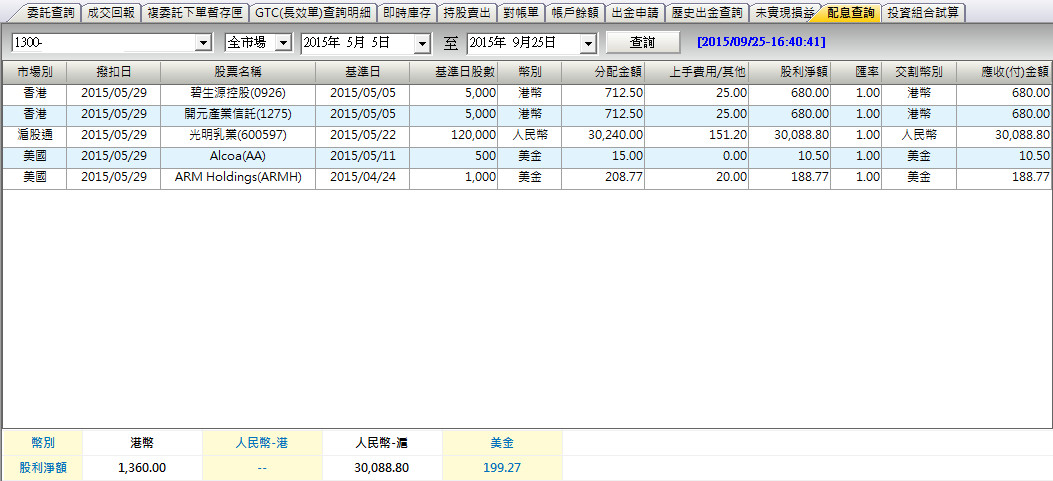 由﹝交易〕頁面群組按鈕的「複委託」點選「配息查詢」。