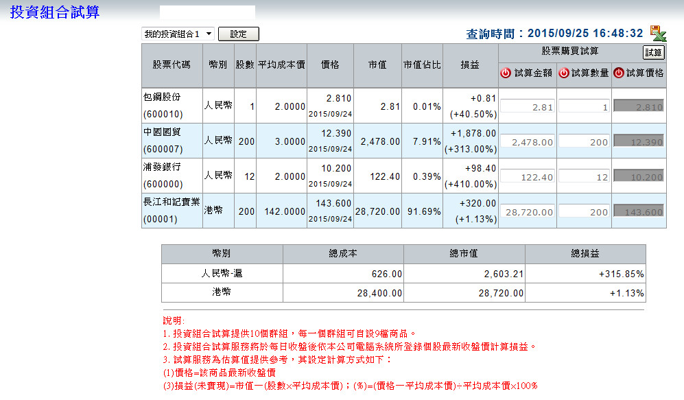 由﹝交易〕頁面群組按鈕的「複委託」點選「投資組合試算」。