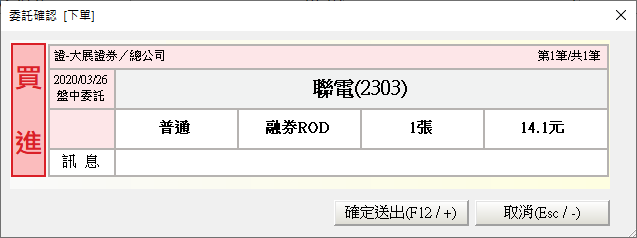 )按鈕,會彈出「委託確認」下單對話盒如下圖,按下〔確定送出〕鈕,