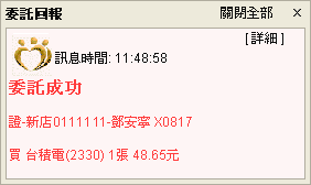 在使用者設定警示視窗為主動回報的情況時,當委託資料成立,警示視窗會在螢幕右下方顯示出來,使用者必須手動關閉視窗,才會把警示視窗關閉,否則會一直停留在螢幕上供使用者查看。