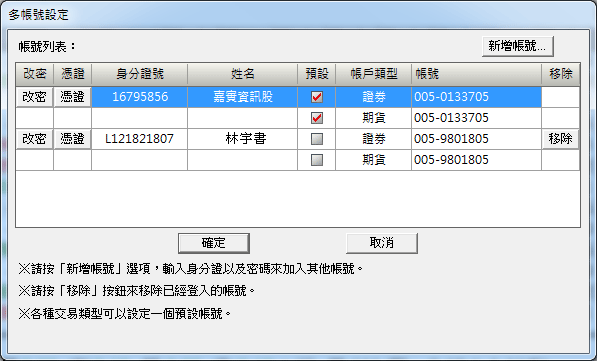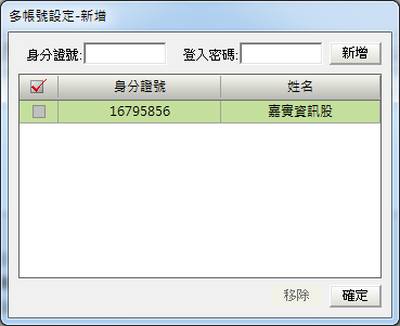 ) 按下此鈕,彈跳出〔多帳號設定 - 新增〕視窗,可由此視窗輸入〔身分證號〕、〔登入密碼〕按(